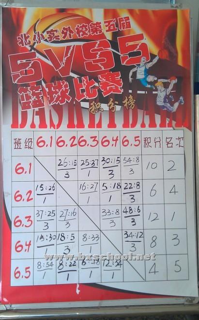 2013北小实外校第五届校园篮球赛本周圆满结束。本次赛事第一次加入了一二三年级的技巧运球和投篮比赛,六年级突破往年常规形式,尝试了全场五对五的比赛。此次活动不仅活跃了校园气氛,激发我校学生的运动热情,提高学生的篮球水平,培养他们团结协作的精神,而且增进了各班级间的友谊。相对于比赛结果而言,参赛同学更注重参与比赛的过程,在场上他们尽情释放个性,体会运动的乐趣。 最终1.3、1.2、1.1班分别夺得了一年级组的前三名,2.2、2.4、2.1成为二年级的前三甲;在运球技巧赛中3.6、3.5、3.2为班级争得了荣誉,投篮比赛的结果是3.6、3.5、3.4分别夺得前三名;4.1班以全胜战绩傲视群雄,4.3班只输一场,屈居亚军,4.2班在这次活动中收获了团结和友谊,获得了年级组第三名的好成绩;5.3班以绝对实力大获全胜,夺得五年级组第一名,5.2班在与5.3班的对决中败下阵来,仅输一场屈居第二,5.5班全力拼搏到最后,为班级夺得第三名的好成绩;6.3班凭借优异的发挥一举夺得年级组冠军,6.1班实力不俗获得第二,6.4班异军突起获得第三。